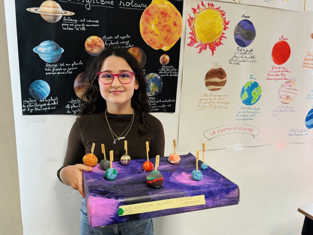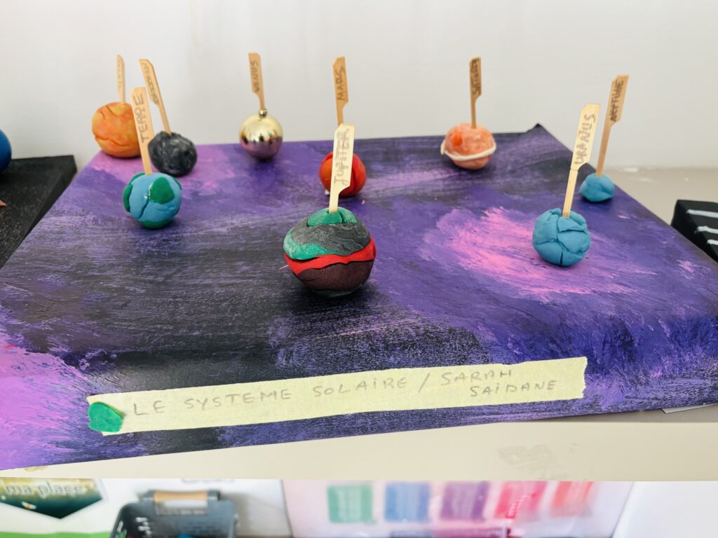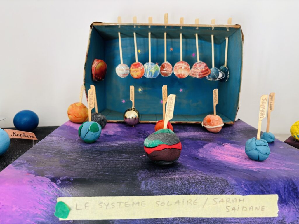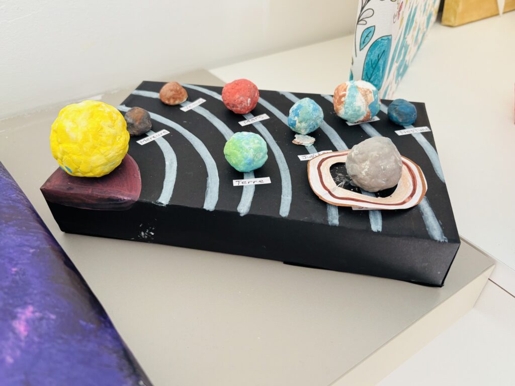 Après une phase de recherche et d’apprentissage en classe consacrée aux planètes, à leurs caractéristiques, à leurs mouvements et à l’organisation du système solaire, les élèves ont réalisé de très belles maquettes illustrant leurs connaissances.