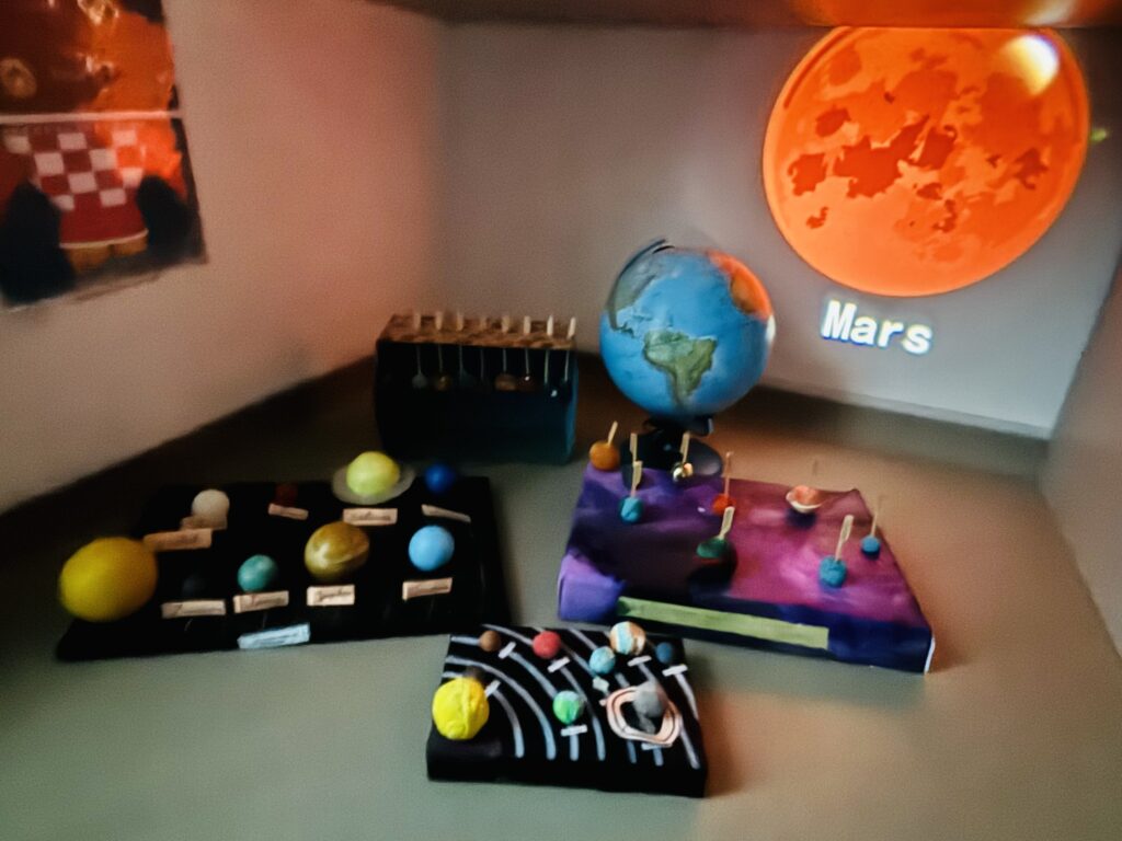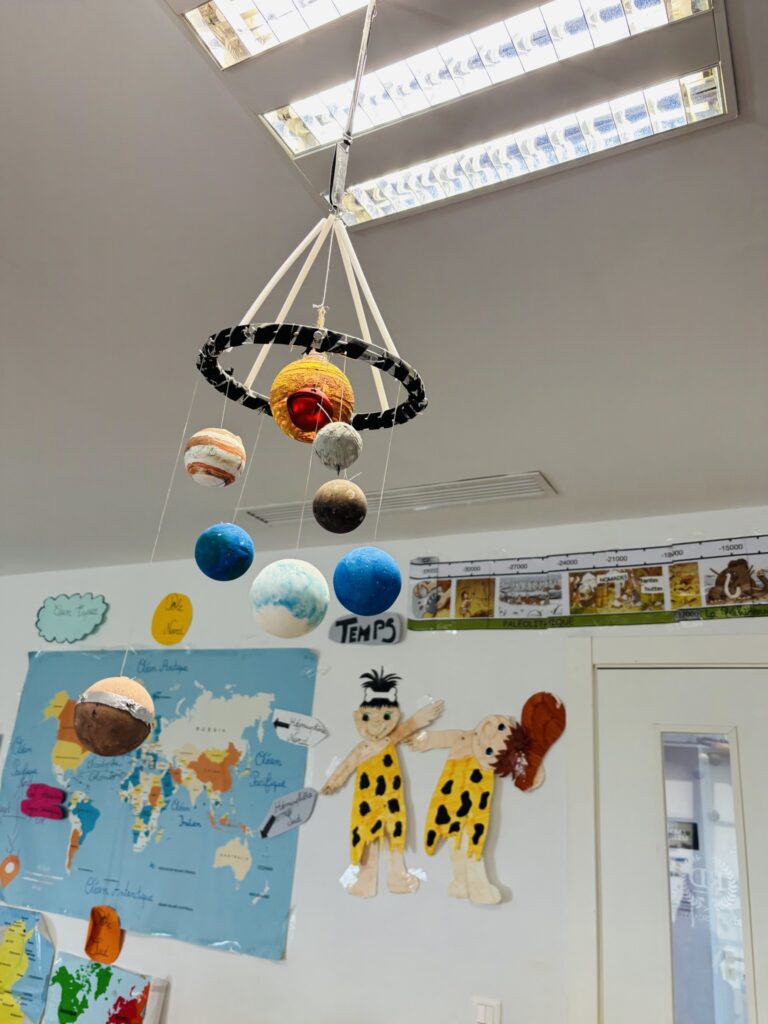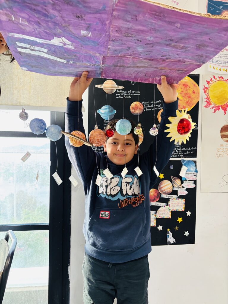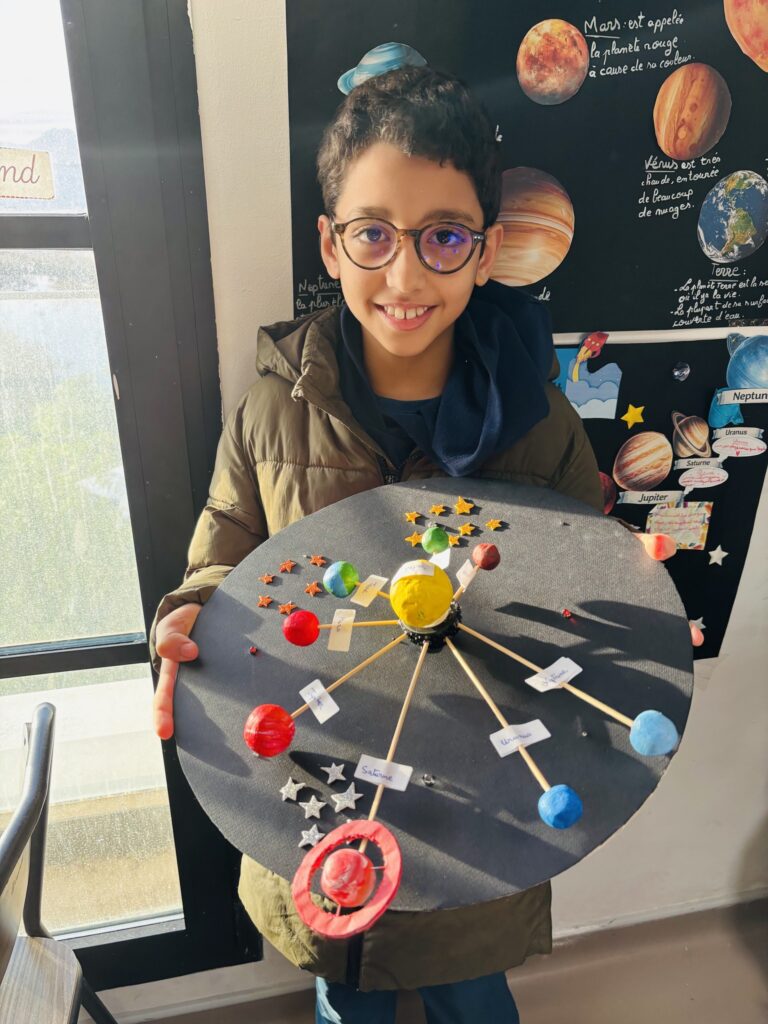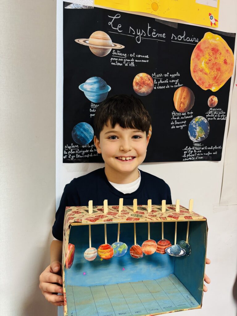 Après une phase de recherche et d’apprentissage en classe consacrée aux planètes, à leurs caractéristiques, à leurs mouvements et à l’organisation du système solaire, les élèves ont réalisé de très belles maquettes illustrant leurs connaissances.